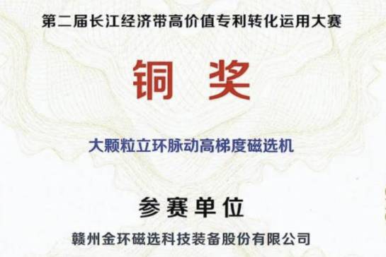 近日,第二届长江经济带高价值专利转化运用大赛颁奖仪式在江西省九江市举行。赣州金环磁选科技装备股份有限公司携“大颗粒立环脉动高梯度磁选机”项目参赛,在市、区知识产权主管部门全过程指导和支持下,从全国1400余个报名项目中脱颖而
