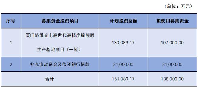 本次募集资金扣除发行费用后,将主要用于两大方向:一是投入10.7亿元建设厦门路维光电高世代高精度掩膜版生产基地项目(一期);二是拿出3.1亿元补充流动资金及偿还银行借款。