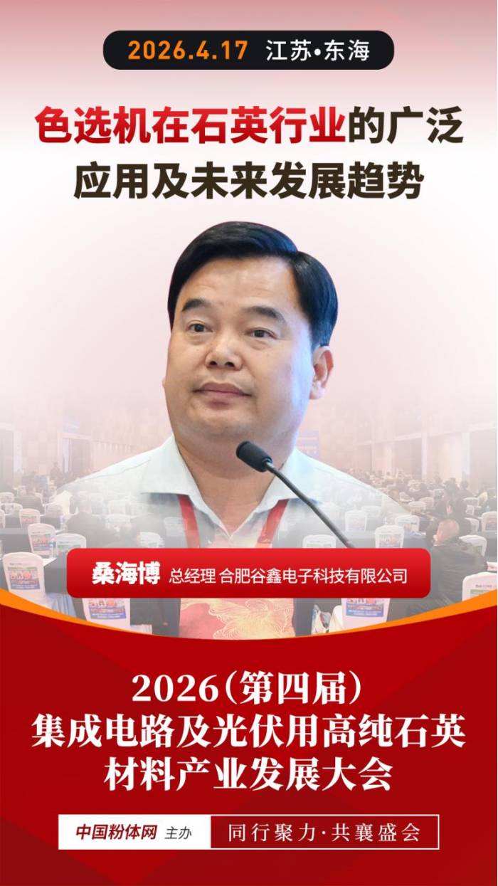 2026年4月17日,中国粉体网将在江苏东海举办“2026(第四届)集成电路及光伏用高纯石英材料产业发展大会”。届时,合肥谷鑫电子科技有限公司总经理桑海博将作《色选机在石英行业的广泛应用及未来发展趋势》的报告。他将深入拆解色选机在石英行业的应用场景,解读行业未来发展趋势,分享谷鑫电子在矿石色选领域的技术成果与实践经验。