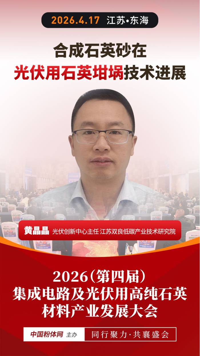 面对合成石英砂在光伏用石英坩埚领域的发展机遇与现存瓶颈,行业亟需权威的技术解读与经验分享,破解应用难题、明确发展方向。在此背景下,2026年4月17日,中国粉体网将在江苏东海举办“2026(第四届)集成电路及光伏用高纯石英材料产业发展大会”。届时,江苏双良低碳产业技术研究院光伏创新中心主任黄晶晶将作《合成石英砂在光伏用石英坩埚技术进展》的报告。他将详细介绍光伏石英坩埚对合成石英砂的需求及合成石英砂的研究进展情况,为行业突破技术瓶颈、推动合成石英砂在光伏领域的规模化应用提供重要参考。